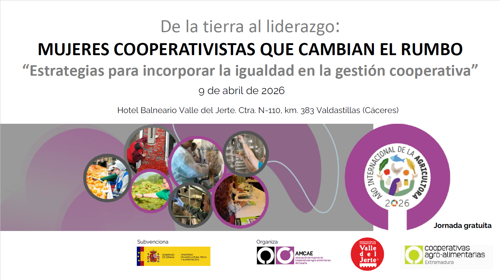 Cooperativas Agro-alimentarias Extremadura celebra el próximo 9 de abril, en Valdastillas (Cáceres), la jornada “De la Tierra al liderazgo: mujeres cooperativistas que cambian el rumbo”, un encuentro impulsado por la Asociación de Mujeres de Cooperativas Agro-alimentarias de España (AMCAE) que busca impulsar la igualdad y el liderazgo femenino en el ámbito cooperativo agroalimentario.