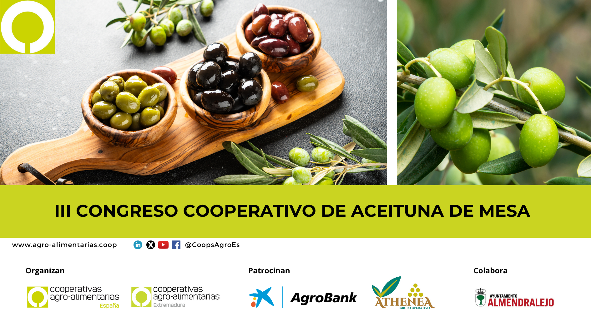 El evento cuenta con el patrocinio de AgroBank–CaixaBank y del Grupo Operativo ATHENEA, y con la colaboración del Ayuntamiento de Almendralejo, que acogerá esta jornada de referencia para el cooperativismo olivarero.